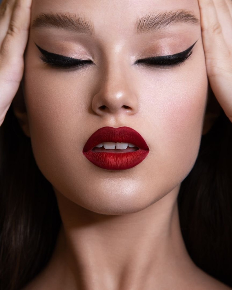 - Красная помада. Тщательно подойдите к выбору цвета и отдайте предпочтение более глубокому и благородному;