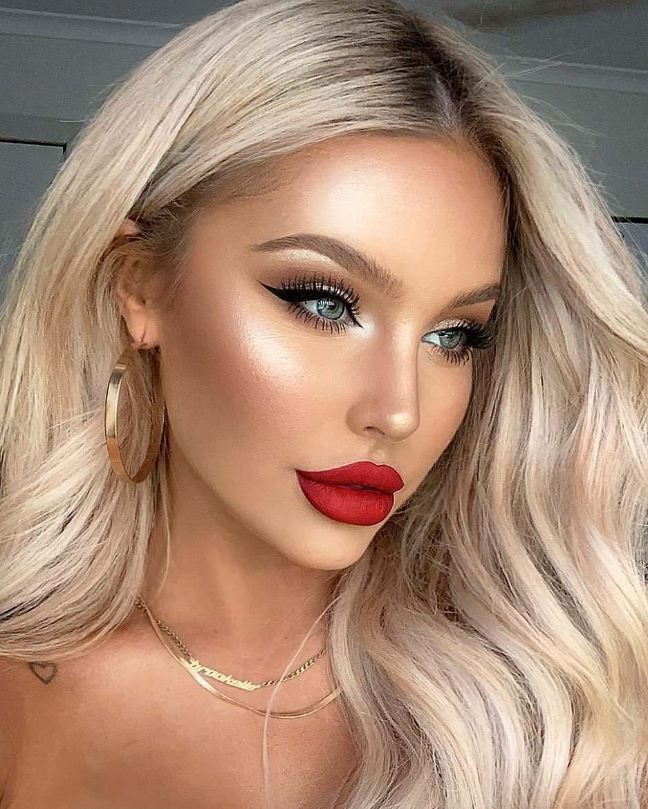Брюнеткам с зелёными или карими глазами подойдёт красный цвет губной помады тёплого оттенка, а блондинке с голубыми глазами и фарфоровой кожей стоит обратить внимание на холодные оттенки фуксии