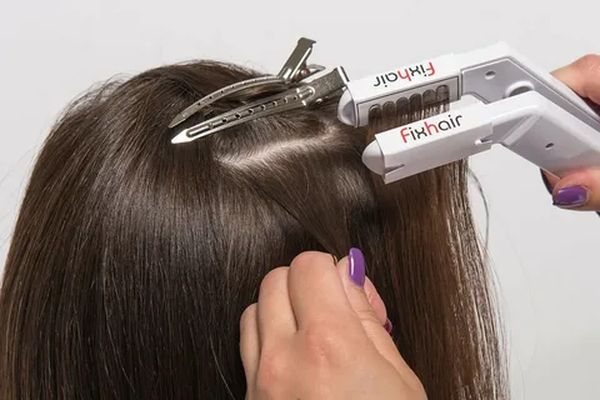Техника предполагает применение клеящей смеси, в составе которой есть краситель, который выбирается в зависимости от цвета натуральных волос).
