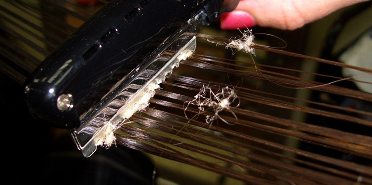 Далее внимательно просматривает каждый сантиметр и убирает торчащие пушащиеся волоски. Делается это при помощи ножниц, от которых тянется шнур к нагревающему аппарату. Их еще называют электроножницами или термоножницами. Пластиковая окантовка инструмента обеспечивает защиту от ожогов.