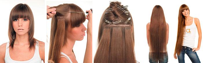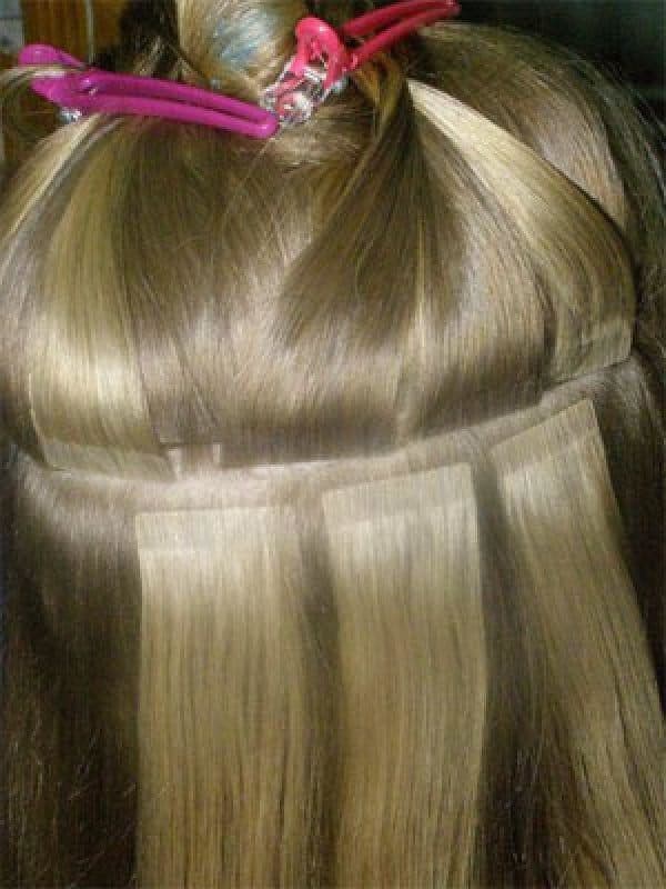 Ленточный метод наращивания предполагает использование специальной ленты, вдоль которой закреплены на равном расстоянии друг от друга искусственные пряди. Лента крепится у самых корней волос специальным клеем.