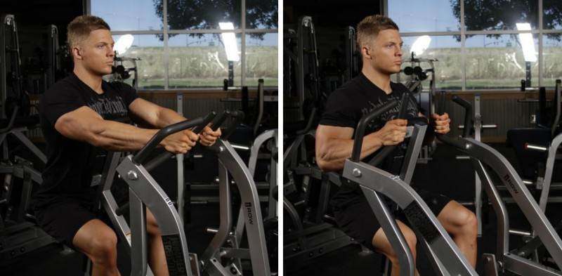 - На выдохе нужно направить вперед рычаги тренажера, делая это плавно с концентрацией на целевых мышцах.