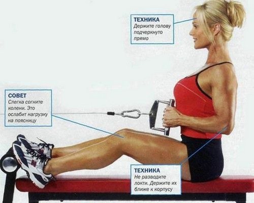 - Положение локтей. Руки занимающейся должны двигаться вдоль корпуса. Не следует отводить их в стороны при тяге горизонтального блока. Это снизит эффективность упражнения.