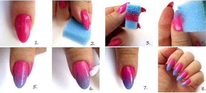 - Губкой похлопывающими движениями смешиваем слои на ногте, не тянем.