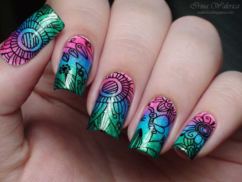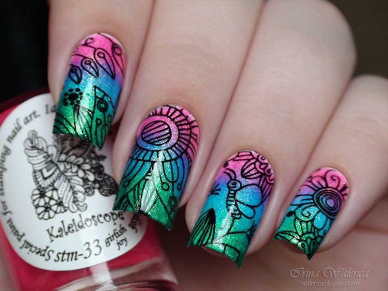 Обратите внимание, что градиентный маникюр дополнен стемпингом, при этом не выглядит перегруженным, смотрится ярко, оригинально и позитивно!