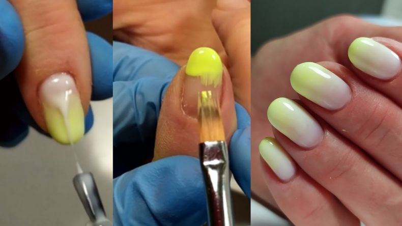 - Не придавливая, провести несколько раз кистью по длине на пересечении оттенков (от кутикулы к кончику). Кисть должна находиться параллельно ногтю, для мягкости разглаживания.