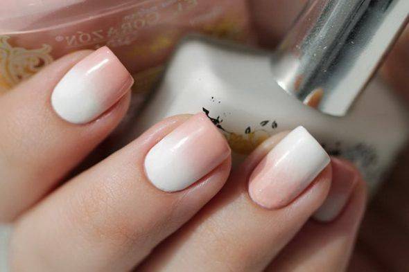 - В стиле французского маникюра. Принцип не меняется, но в качестве цветов используются бежевый или розовый, переходящие в молочный или белый.