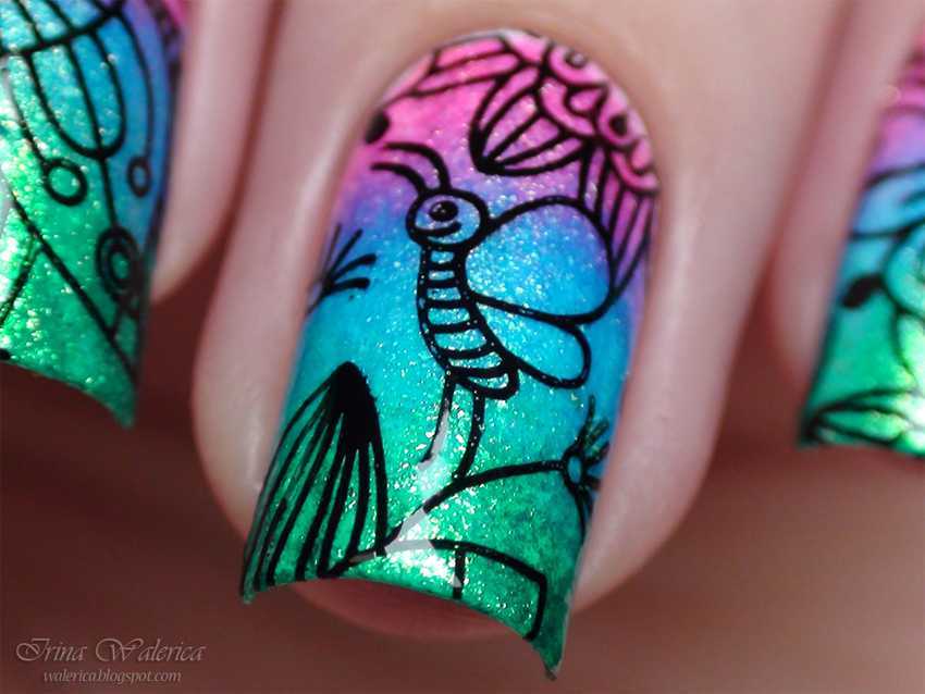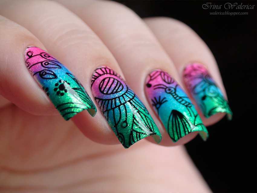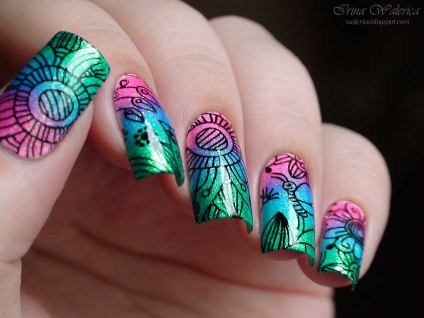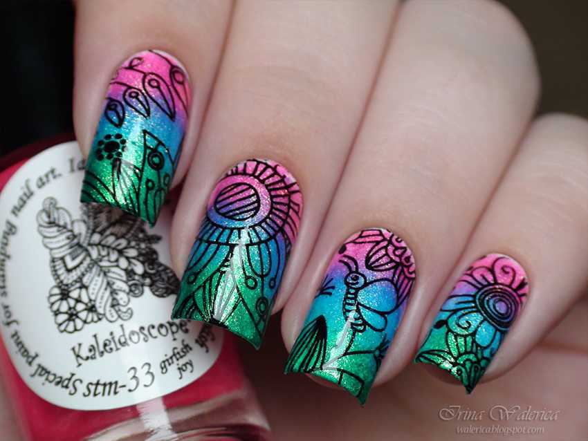 Обратите внимание, что градиентный маникюр дополнен стемпингом, при этом не выглядит перегруженным, смотрится ярко, оригинально и позитивно!