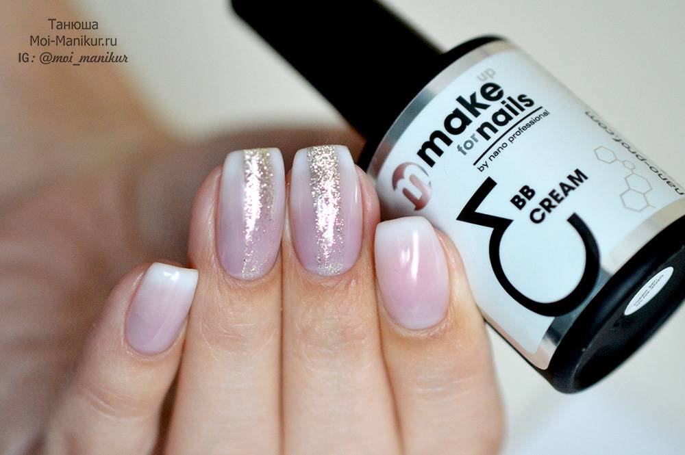 - Блестящий. Как таковой игры цветов здесь нет, используется только один лак. К нему добавляются блестки, количество которых будет уменьшаться ближе к границе перехода.
