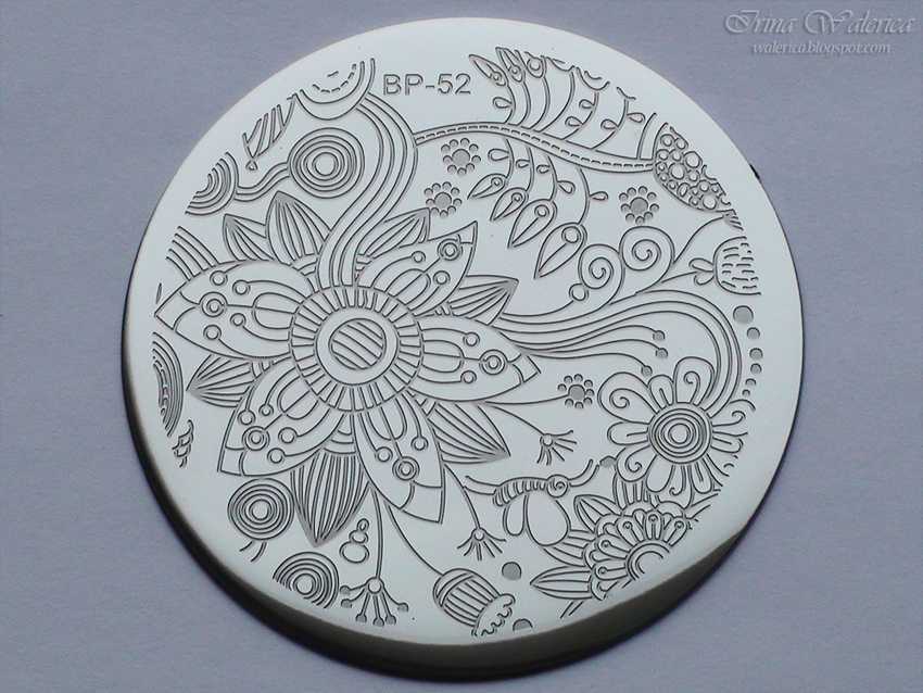 Рисунок нанесен на ногти при помощи металлического трафарета для маникюра с орнаментом «на весь ноготь». Подобный трафарет интересен тем, что каждый раз можно получить новый рисунок.