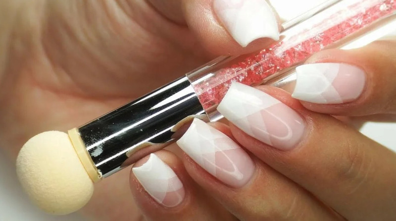 - Губкой похлопывающими движениями смешиваем слои на ногте, не тянем.
