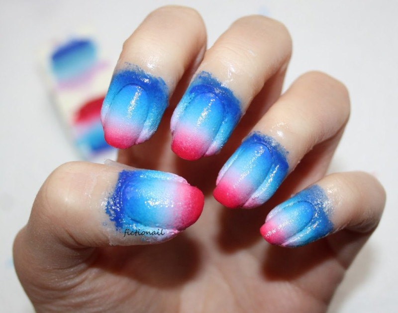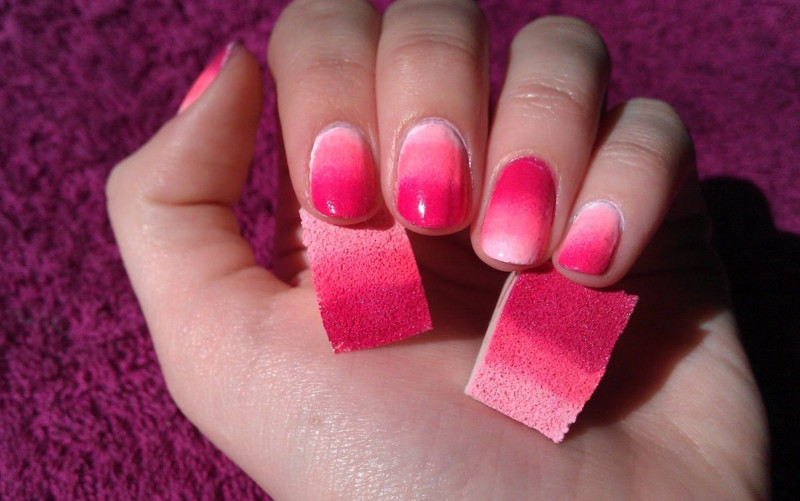 Это один из самых «грязных» способов, и в маникюрных салонах им, как правило, не пользуются. Вместо него сейчас используют много новых техник, помогающих нарисовать ровный градиент кисточкой. Про них мы расскажем чуть ниже.