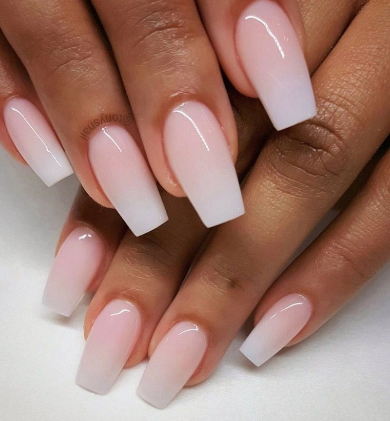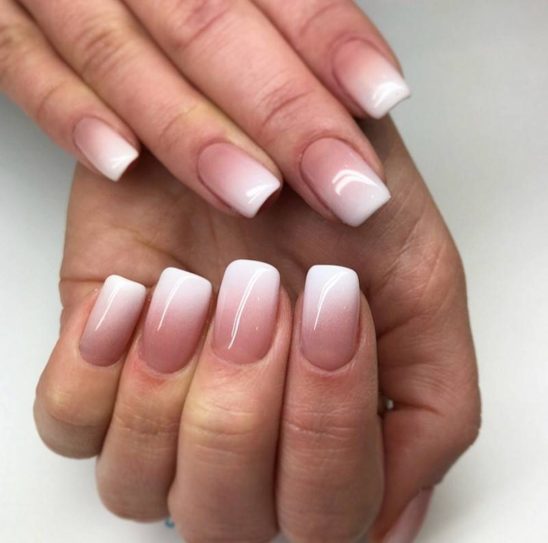 - Baby boomer. Это одна из модных разновидностей деграде, которая совмещает в себе классический французский дизайн с техникой горизонтального градиента. Смотрится нейл-арт очень изысканно и элегантно. Для создания дизайна используют нюдовые оттенки с переходом к белому, по мере движения к краю ногтя. Кроме изящества, этот вариант притягателен тем, что можно делать подобный нежный градиентный маникюр на короткие ногти, равно как и на длинные.