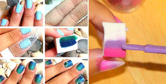 Губка. Ногти окрашивают в базовый цвет, а отдельно готовят лак с переходом оттенков. Для этого делают две капли разных колеров (либо тонов) на небольшом расстоянии друг от друга. Далее палочкой смешивают цвета, чтобы получить переход. После остается обмокнуть спонж и перенести рисунок на ноготь. Делают это похлопывающими движениями. Вести по пластине губку нельзя — переход смажется!