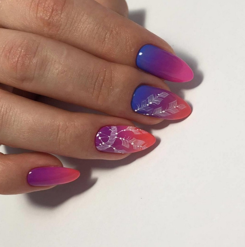 Если вы знаете особенности техники с гелевыми лаками, то для вас будет актуальным экспериментирование с несколькими переходными цветами. Принципы нанесения таких ногтевых покрытий будут не одинаковы с методами для обычных лаков. Процессы сушки и закрепления для гелевых лаков будут проходить по технологии, специфичной их нанесению.