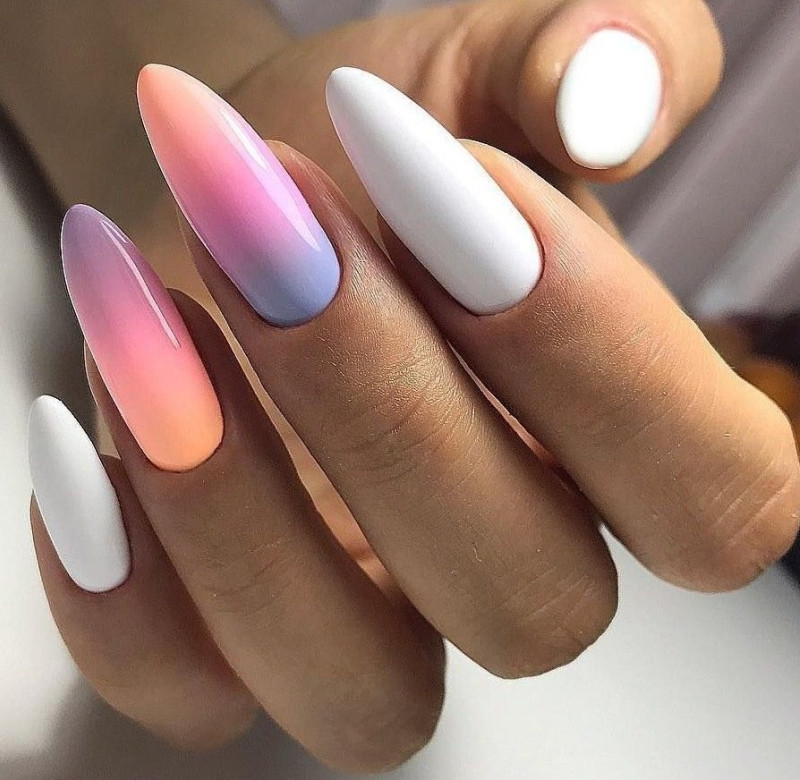 Миндаль — универсальная и очень красивая форма ноготков, которая зрительно удлиняет пальцы. Для неё будет идеальным вертикальный градиент, разноцветный дизайн, техника с акцентом на кончики ногтевой пластины.