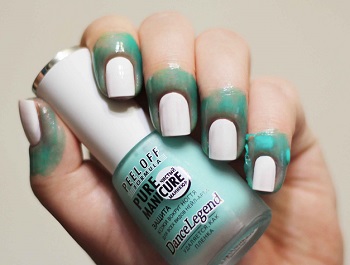 Лак в несколько приемов наносится полоской на губку, затем губку с лаком прижимают к краю ногтя, стараясь немного сгладить границу.