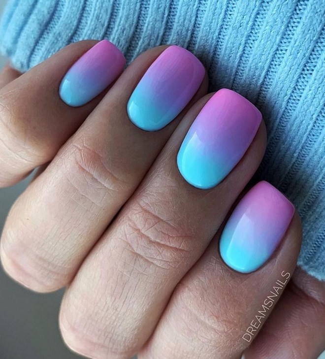 Самая смелая комбинация маникюра – контрастный градиент. Примеры сочетания: солнечный желтый и сиреневый, глубокий синий и оранжевый, фиолетовый и изумрудно зеленый, голубой и розовый. Комбинации бывают в теплых, холодных, ярких горячих оттенках. Экспериментируйте, сочетая светлые и темные цвета, пастельные и насыщенные палитры. Двухцветный маникюр контрастных цветов подойдет под любое настроение, стиль или мероприятие, стоит только правильно выразить свое желание.