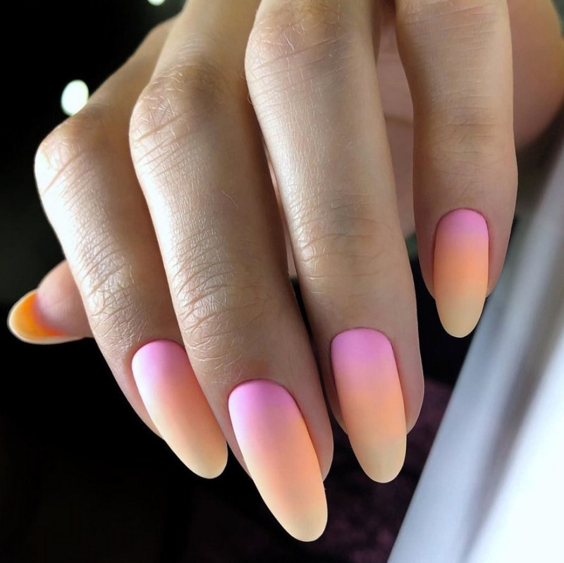 Аэрограф. Работа очень тонкая и не допускает неловких движений. Сначала ноготь окрашивается в базовый цвет. Когда первый слой полностью высыхает, можно распылять второй оттенок аэрографом, добиваясь желаемой интенсивности перехода. В этом и заключается сложность: движения должны быть плавными, без рывков.