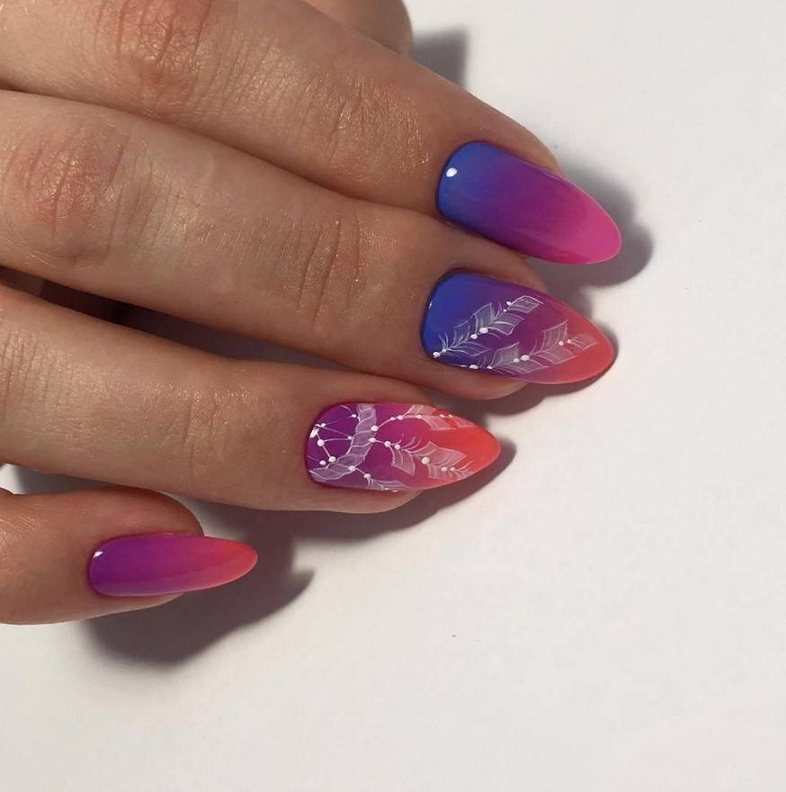 Если вы знаете особенности техники с гелевыми лаками, то для вас будет актуальным экспериментирование с несколькими переходными цветами. Принципы нанесения таких ногтевых покрытий будут не одинаковы с методами для обычных лаков. Процессы сушки и закрепления для гелевых лаков будут проходить по технологии, специфичной их нанесению.