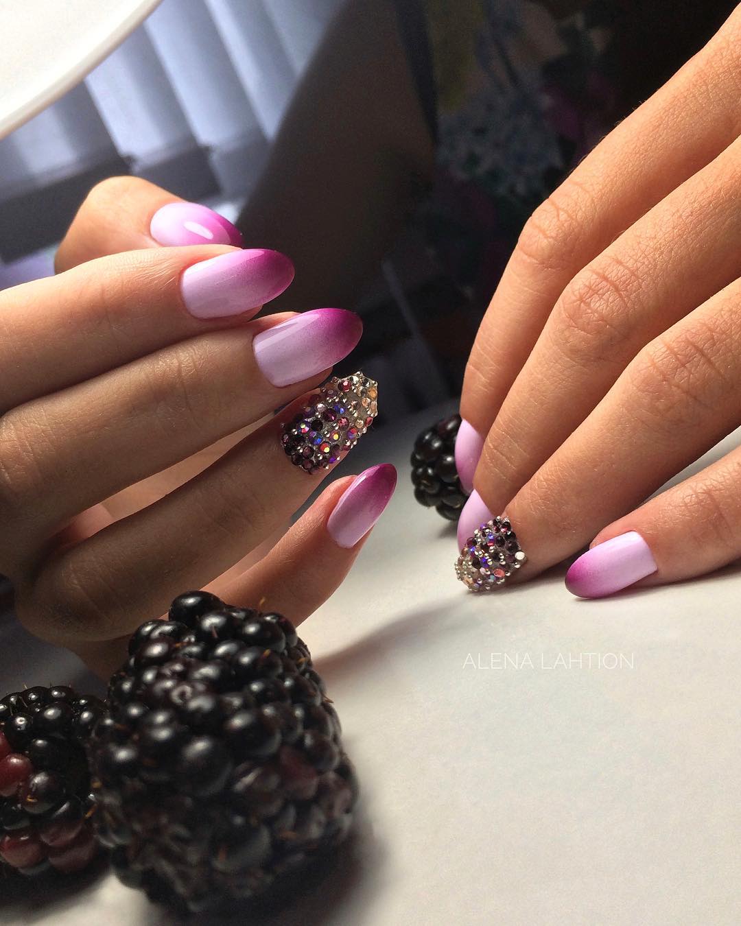 Лучше применять нежные тона для пастельного, молочного омбре, но дополнять их стразами, рисунками, блёстками.