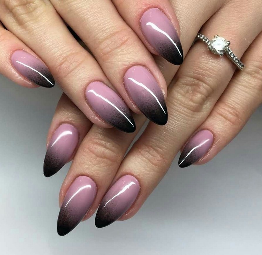 Аэрограф. Работа очень тонкая и не допускает неловких движений. Сначала ноготь окрашивается в базовый цвет. Когда первый слой полностью высыхает, можно распылять второй оттенок аэрографом, добиваясь желаемой интенсивности перехода. В этом и заключается сложность: движения должны быть плавными, без рывков.