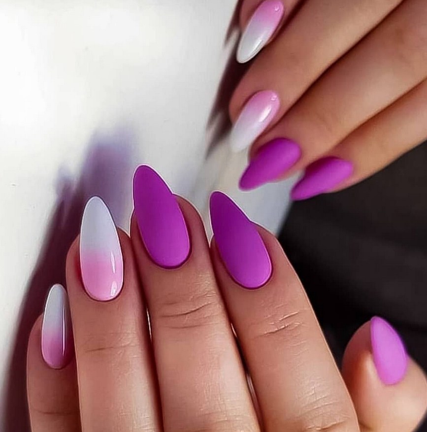 Самая смелая комбинация маникюра – контрастный градиент. Примеры сочетания: солнечный желтый и сиреневый, глубокий синий и оранжевый, фиолетовый и изумрудно зеленый, голубой и розовый. Комбинации бывают в теплых, холодных, ярких горячих оттенках. Экспериментируйте, сочетая светлые и темные цвета, пастельные и насыщенные палитры. Двухцветный маникюр контрастных цветов подойдет под любое настроение, стиль или мероприятие, стоит только правильно выразить свое желание.