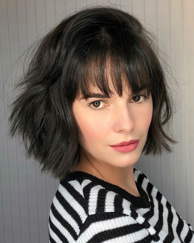 Подходит для коротких стрижек. Может быть только выше бровей, либо экстремально короткой. Доходящая до середины лба с удлинением к вискам, напоминающая полукруг, красиво смотрится со средней длиной.
