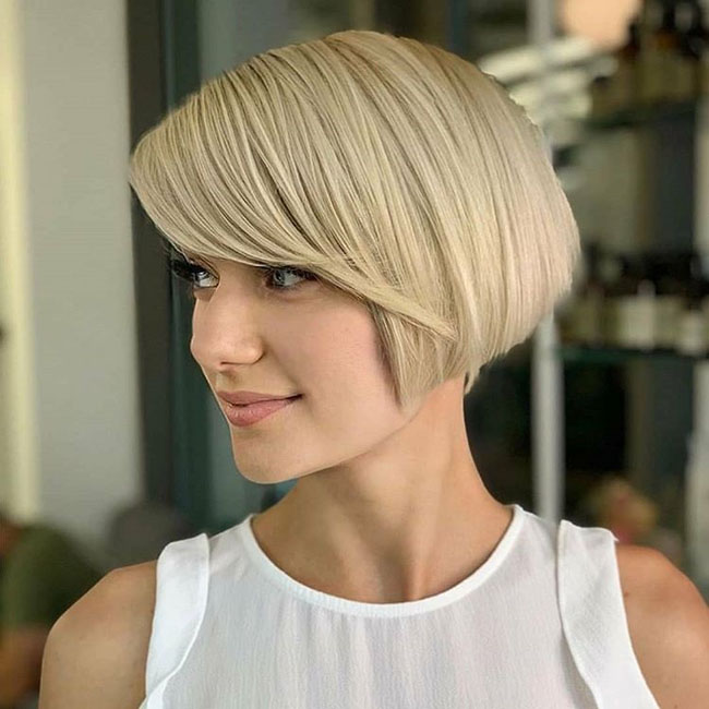 - Короткие стрижки на прямые волосы смотрятся модно не только на молодых девушках, но и на женщинах постарше. Но при условии, если кожа лица и шеи имеет ухоженный и здоровый вид. Для такой категории модниц есть интересное и креативное решение. Градуированный каскад с применением формы стрижки боб. Хорошо сочетается с косой профилированной челкой. Меняя укладку прически можно добиться делового стиля и легкого, вечернего варианта.