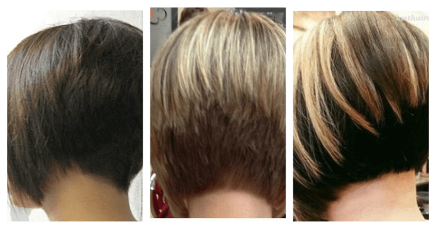 - Закрепив пряди сверху, можно начать стричь с края, начиная от затылочной части: чем ближе боковые пряди к фронтальной части — тем они длиннее волос сзади на затылке. Каждая прядь состригается под острым углом к верху. По окончанию волосы нужно уложить. Вы должны увидеть гладкую структуру, переходящую от коротких прядок к удлинённым. Останется подровнять волосы по сторонам.