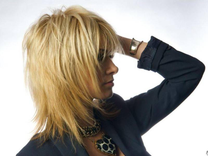 Дополнительный объём создаётся на макушке и в области скул за счёт более коротких прядей, рваные кончики добавляют причёске кокетливость и лёгкость.