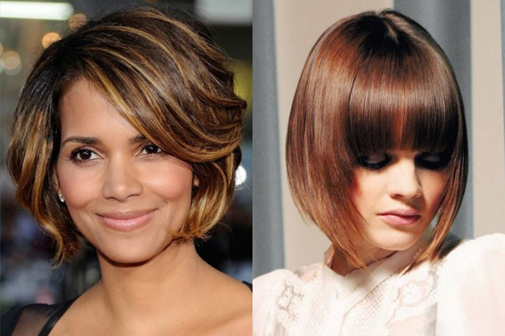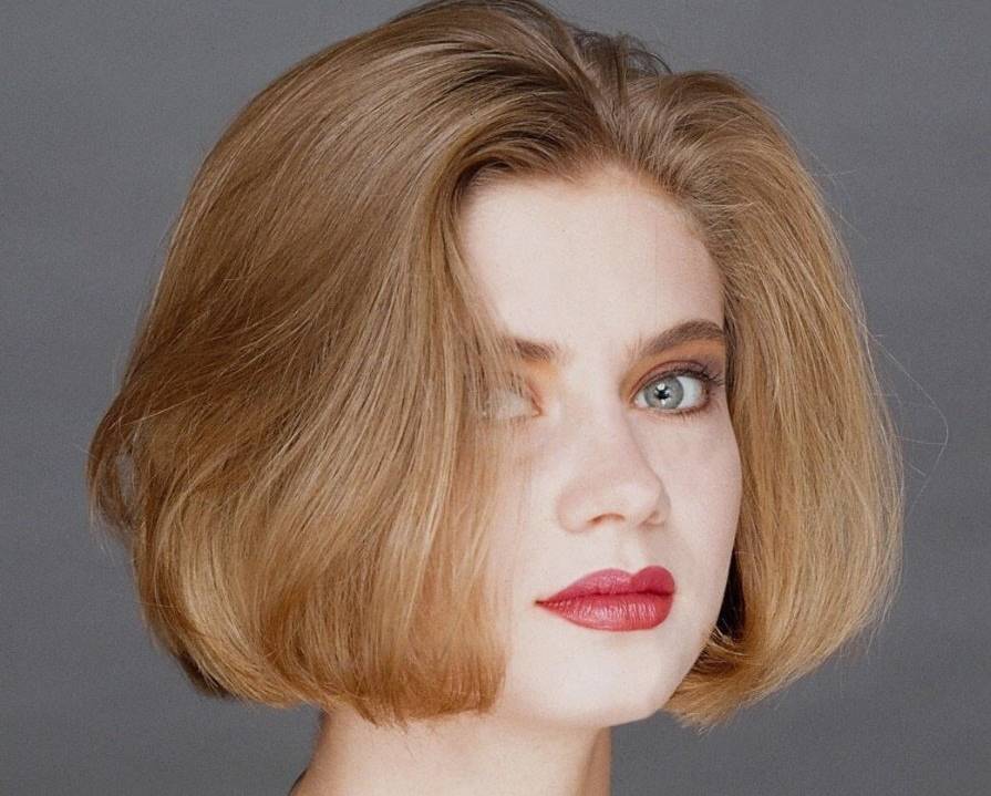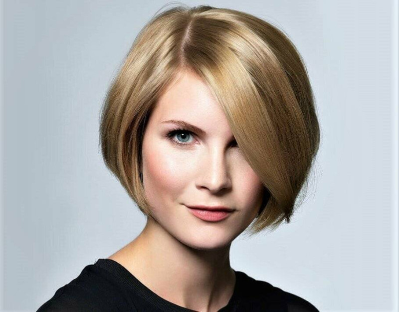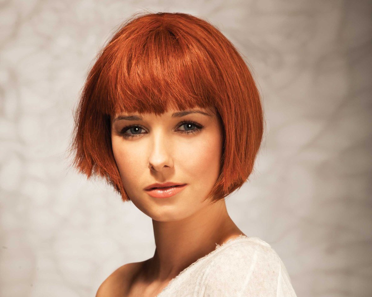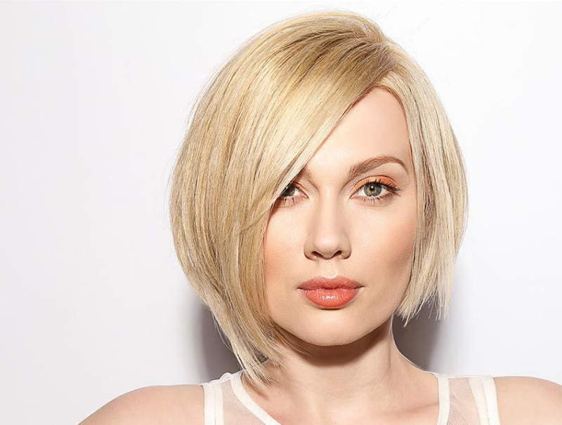 Градуированное каре с косой челкой визуально вытягивает лицо