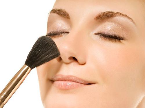 - Наносят пудру на лицо легкими движениями кисти сверху вниз по росту пушковых волосков, начав с Т-области.