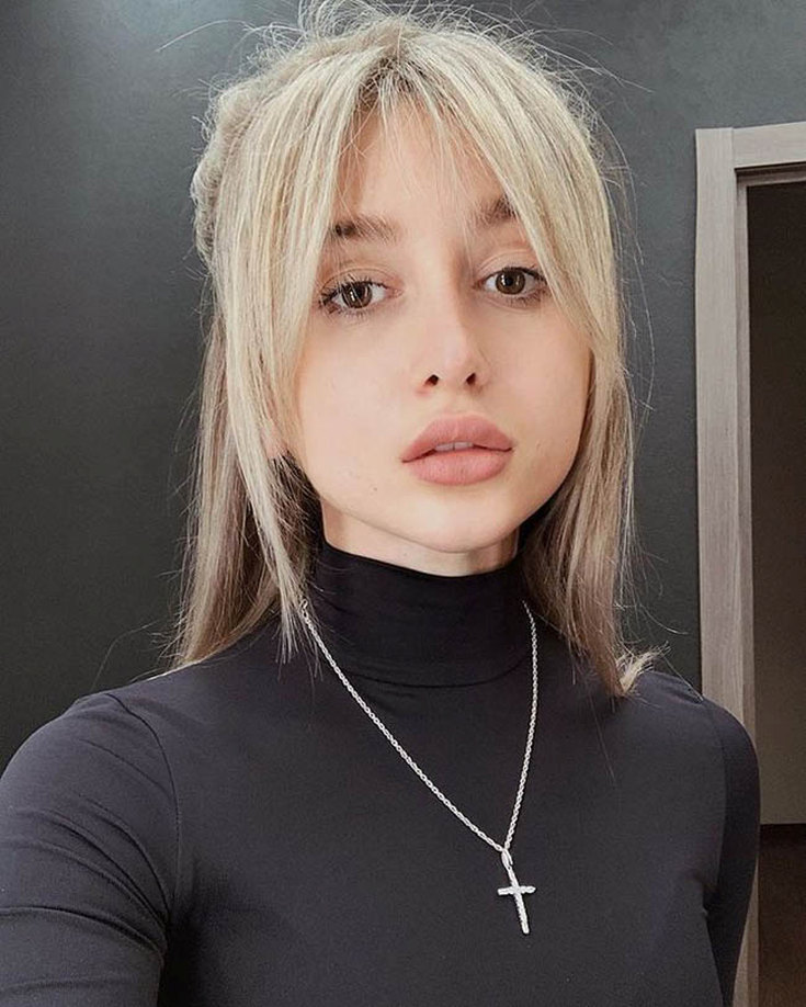Чтобы черты были сбалансированными и четко очерченными, нужно сделать объемную и филированную челку, раздвоенную на две части.