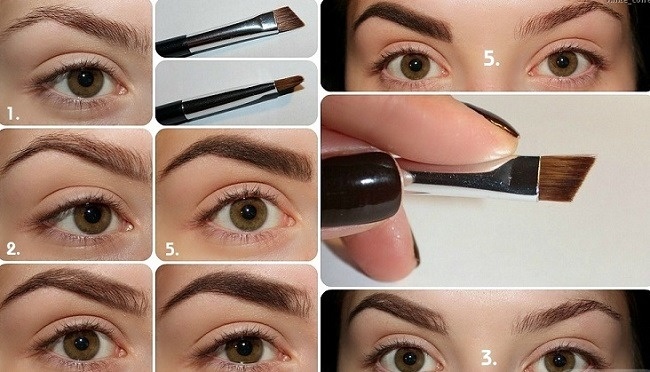 Чтобы накрасить брови с помощью теней вам понадобится скошенная кисть. Для начала прорисуйте контур, затем заполните внутреннее пространство более светлым оттенком теней.