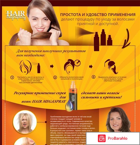 Отзывы о Hair megaspray можно встретить самые различные. И естественно, на самих сайтах продажи они всегда положительные. Нам обещают уменьшение выпадения волос на 90%, снижение ломкости на 95%, увеличение объема в два раза и вообщем, значительное улучшение общего состояния волос за короткий срок. В отличие от многих других разрекламированных препаратов, здесь можно поверить в то, что мегаспрей действительно обладает некоторыми положительными свойствами.