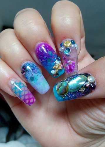 Можете быть уверены в том, что дизайн ногтей “Аквариум” будет неповторим. Для нанесения аквариумного стиля используют такое разнообразие декора, что повториться в нем невозможно. Пудра, краски, стразы с блестками, декоративные камешки, сухоцвет, частички тканей, кружева и фактурных нитей, перламутровый бисер, перышки, цветной песок, фольга и многие другие материалы, на любой вкус и фантазию.