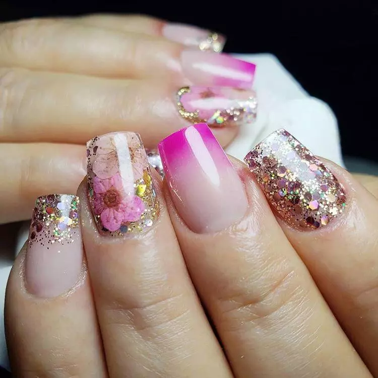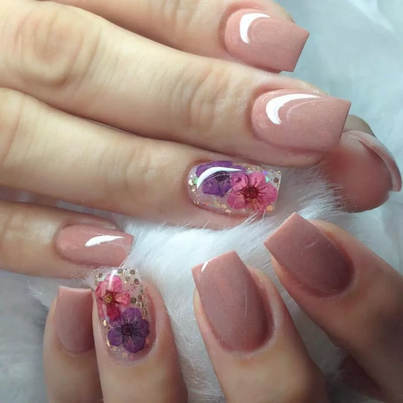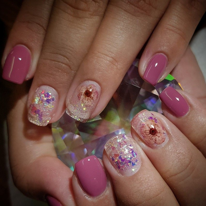 Подобный маникюр выгодно подчеркнет длинные ногти, однако он противопоказан коротким ноготкам. Ни с чем несравнимая естественность, хрупкость и нежность засушенных натуральных цветов придаст вам неповторимую очаровательность. Цветы необходимо тщательно выбирать по размеру, чтобы не исказить и не испортить узор. Дизайнеры рекомендуют использовать аквариумный дизайн в сочетании с французским или лунным маникюром.