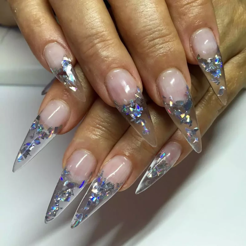 Данный маникюр подойдет девицам, которые выбирают среднюю длину ногтей. Включайте вашу фантазию и творите волшебство с помощью мерцающих блесток! Вы можете использовать крупные блестки (они наносятся на ноготь дотсом) или мелкие (используйте для его нанесения кисть), а также обсыпать разными блестками каждый ноготок.