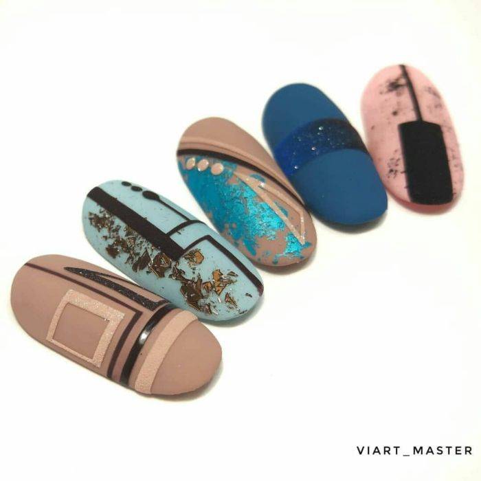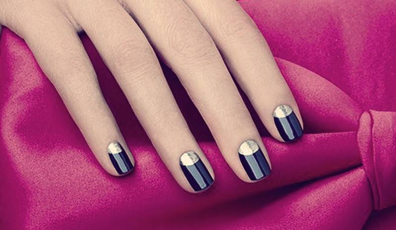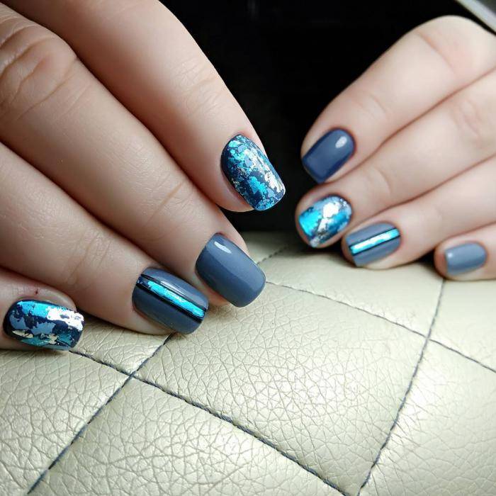 Многие девушки видели фото дизайна, получившего название маникюр «битое стекло». Его можно дополнить геометрическими узорами. Прекрасным вариантом будет вырезать из фольги разные фигурки геометрической формы. Маникюр с полосками из фольги выглядит стильно и мегамодно. Данный вариант идеально подходит как для вечернего мероприятия, так и деловой встречи или работы в офисе, где требуется придерживаться строгого дресс-кода.