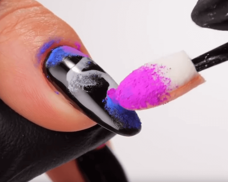Предварительно подготовленные ногти с заранее нанесённым праймером покрываем слоем чёрного лака. Сушим, наносим слой топа. Когда он немного подсохнет, распределяем по ногтевой пластине пигмент и начинаем втирать. Чем дольше полировка – тем более зеркальным становится результат.