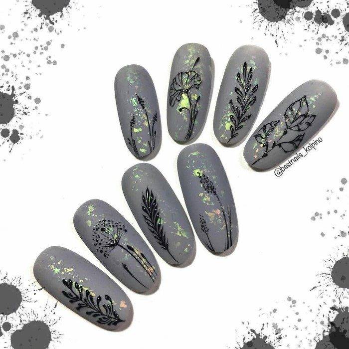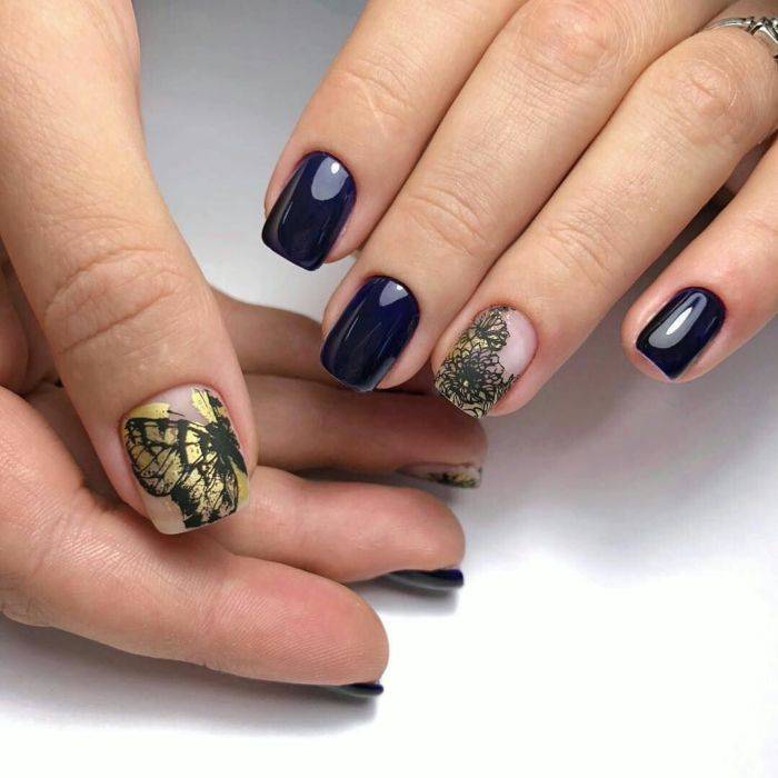 Интересный и стильный получается маникюр, если одновременно использовать несколько приемов. Модный маникюр с фольгой в сочетании с рисунками смотрится оригинально и современно. Можно прибегать к нанесению на гель-лак росписи и фольги, дополнить графическими мотивами или наклейками слайдерами. В совокупности это позволяет в домашних условиях получить непревзойденный дизайн с фольгой.