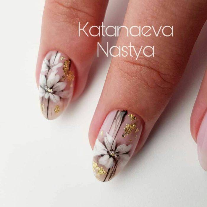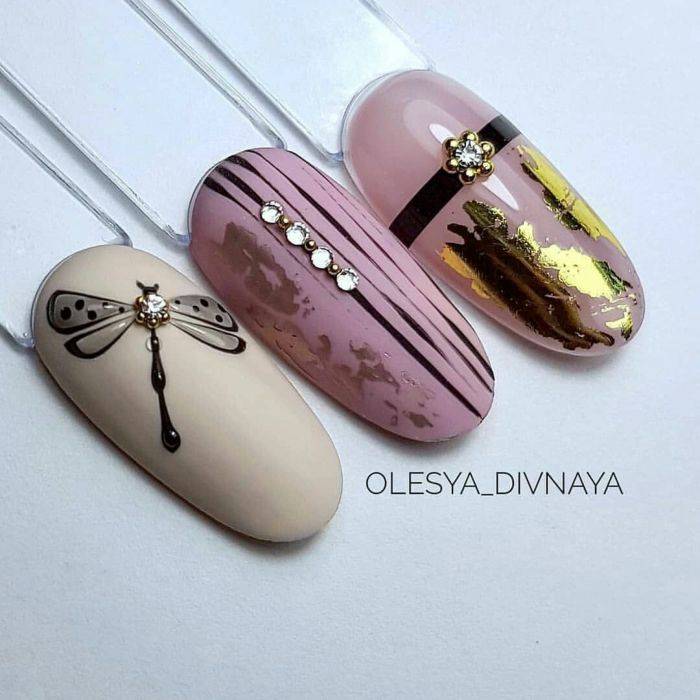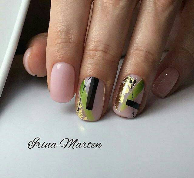 На первый взгляд кажется, что маникюр с фольгой 2020 и минимализм просто несовместимы. Но это не так! Прекрасным примером будет использование рисунков, фольги и прозрачного лака. Если возникает вопрос, как сделать маникюр с фольгой самостоятельно, можно выбрать следующий вариант – использование переводной фольги. Штрихи и прямые линии прекрасно дополнят лаконичные узоры из фольги.