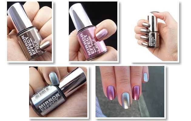 - Сейчас во многих косметических магазинах на полках красуются баночки разных марок и брендов с зеркальным лаком для ногтей. Этот зеркальный лак, как и пленки minx имеет богатую палитру цветов, вы можете найти классические тона, как серебряный и золотой, так и совсем креативных цветов- салатовый, оранжевый, малиновый. С этим отражающим средством можно создать не менее модный маникюр.