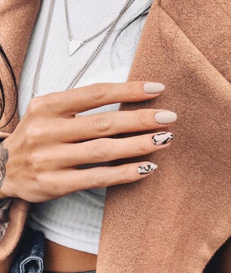 Эффект дыма замечательно смотрится как на глянцевом, так и на матовом покрытии. Теоретически для фона можно взять гель-лак любого цвета, но рекомендуется использовать черный или белый, а также бежевые и пастельные тона. Дымчатые разводы хорошо смотрятся и на камуфлирующем геле, имитирующем натуральный цвет ногтя.