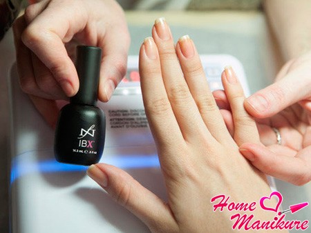 - Нанесение первого слоя Ibx. Этот слой проникает в структуру ногтя и укрепляет его.