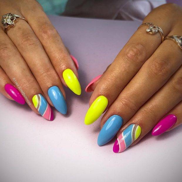 Именно такой маникюр максимально актуален. Длина снова вернулась в список трендов, тем более, переходы цвета на нем смотрятся особенно эффектно. На фото модных тенденций маникюра омбре светлые оттенки встречаются в сочетании с чем-то максимально ярким. Слишком нежные, неброские и невыразительные дизайны под офисный стиль остались в прошлом. Белый и кислотный – вот отличный пример того, что стоит попробовать в новом сезоне.