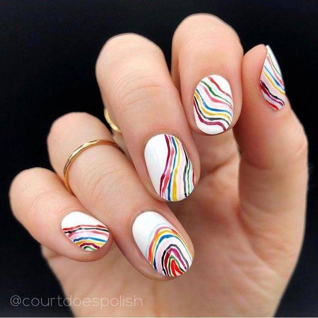 Мазки из акварели белого цвета. Для выполнения этой техники потребуется плоская кисть и акварельные белила. На край ногтя наносят немного белой краски. Можно также использовать кисть средней толщины и, делая небольшие мазки, изменять фон рисунка.