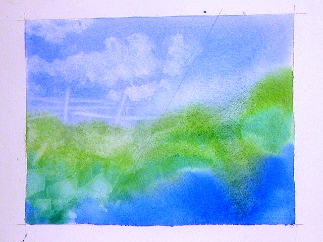 Эта техника потребует несколько губок. Она подходит для изображения облаков, мягкого света. А еще ею можно контролировать поведение красок.