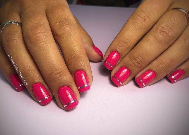 Сначала на ноготь наносят базу, выравнивающую поверхность пластины. После ее высыхания покрывают розовым лаком в 2 слоя. Затем с верхнего левого угла рисуют 2 параллельные бордовые линии – одну потолще, вторую – потоньше. Теперь с правого угла проводят такие же полосы. Добавляют серебристую лини и закрепитель, а также при помощи зубочистки наносят стразы. Прекрасный маникюр готов!